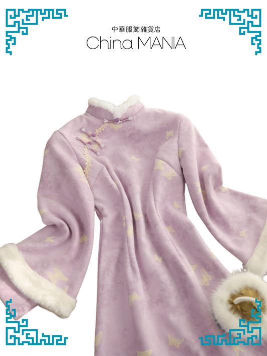 【旗袍ワンピ】紫×花×ワンピース【秋冬新作】