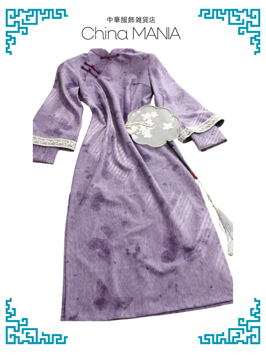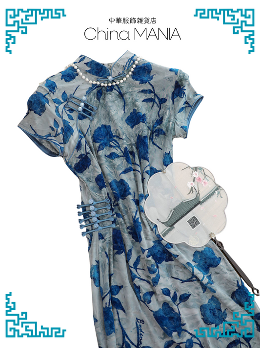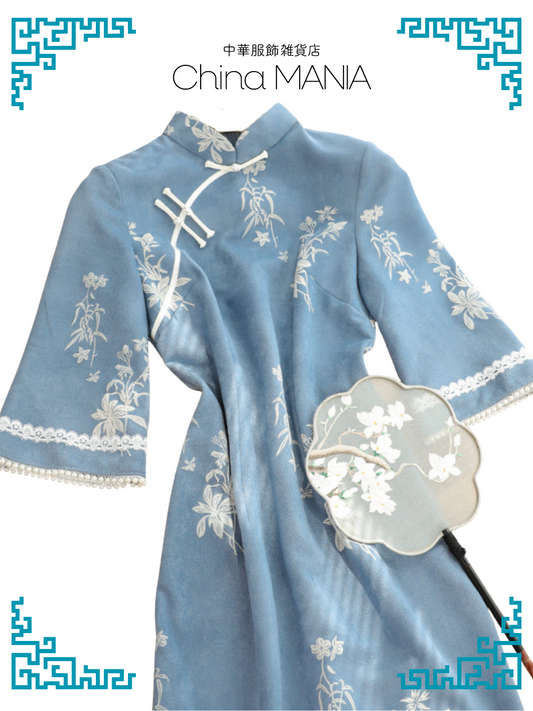【旗袍】ブルーグレー×花柄×七分袖【秋冬新作】