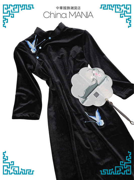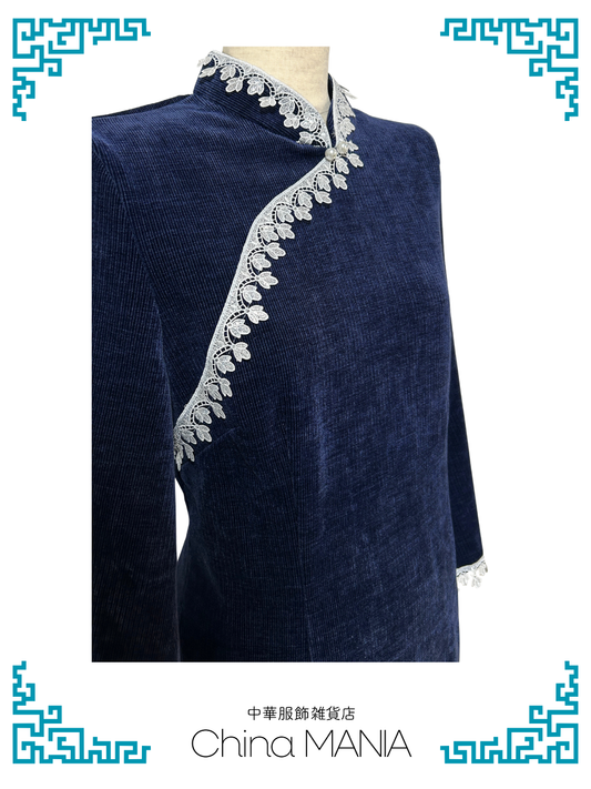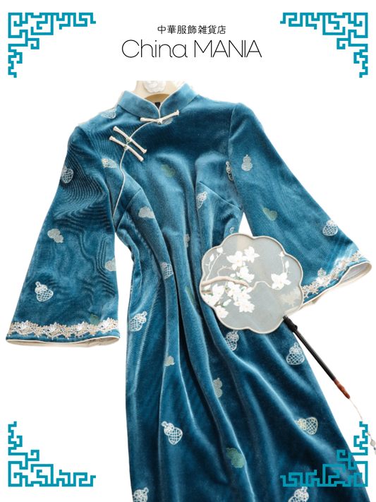 【旗袍】青×ひょうたん×七分袖【秋冬新作】
