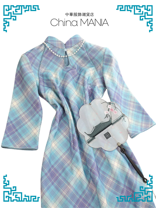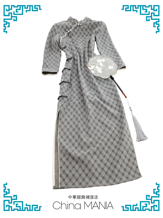 【旗袍】グレー×チェック×七分袖【秋冬新作】