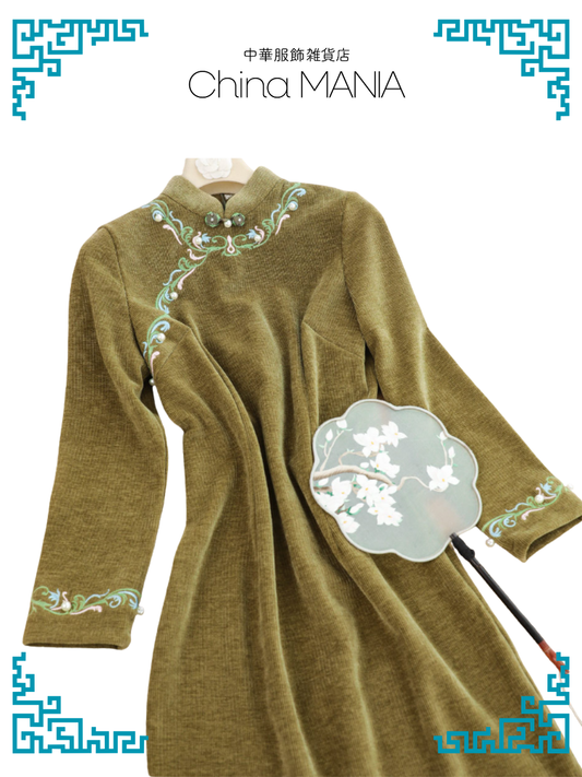 【旗袍】緑×刺繍×長袖【秋冬新作】