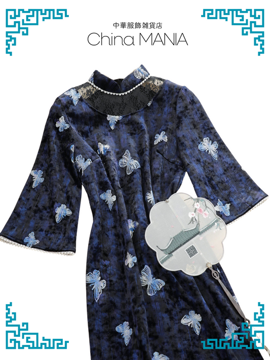 【旗袍】青緑×蝶と薔薇【秋冬新作】
