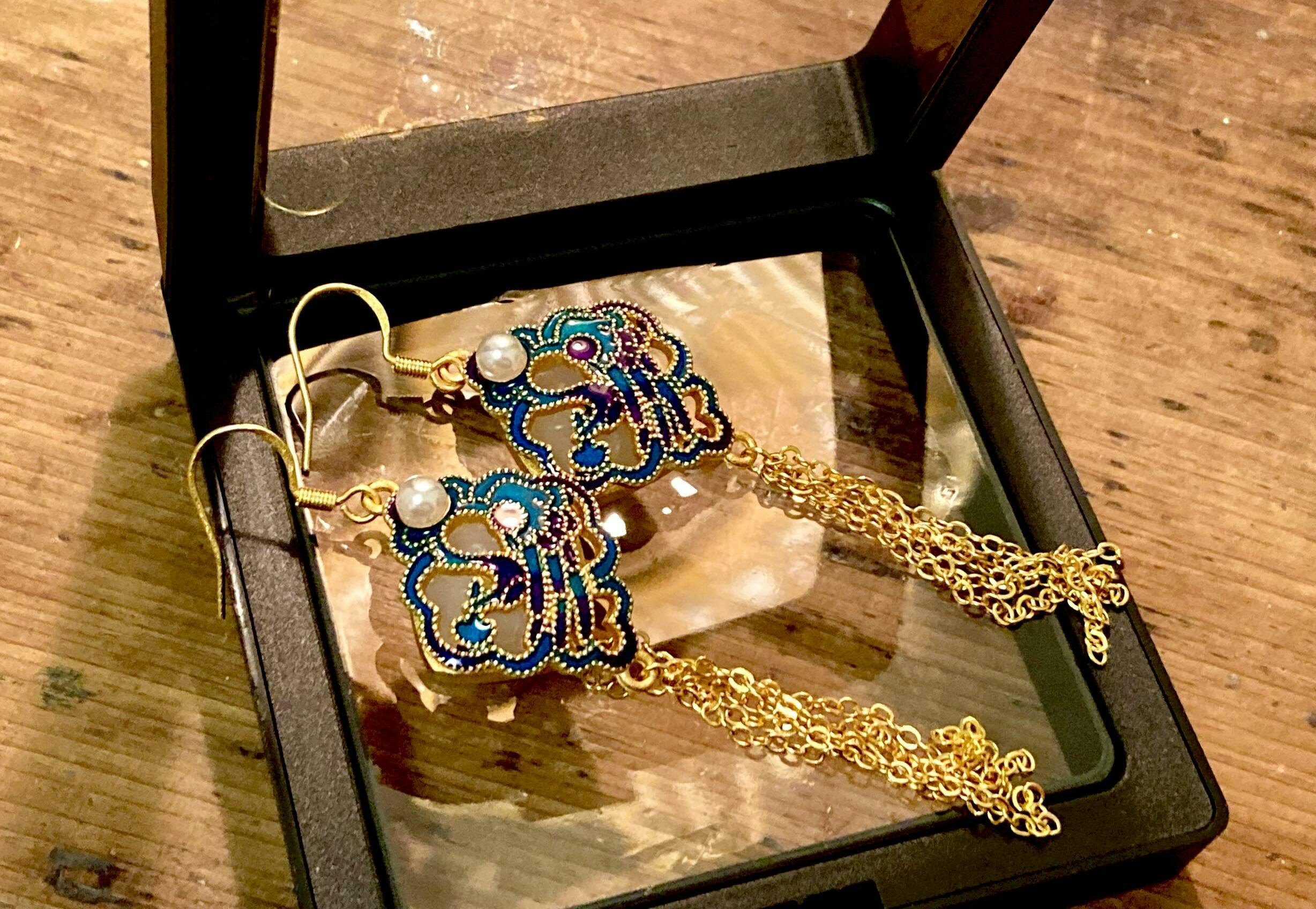東方青藍、今日お迎えしました。寒色系でかつ華やかな大ぶりのピアスを探していましたが、想像以上の美しさでずっと眺めていられます✨房(チェーン)が多くて長いピアスは日本でなかなか見つけられないので、秒で購入させて頂きました。手書きのメッセージまで有難うございます!再利用可能なピアスケースも頂いて二重の驚きでした。