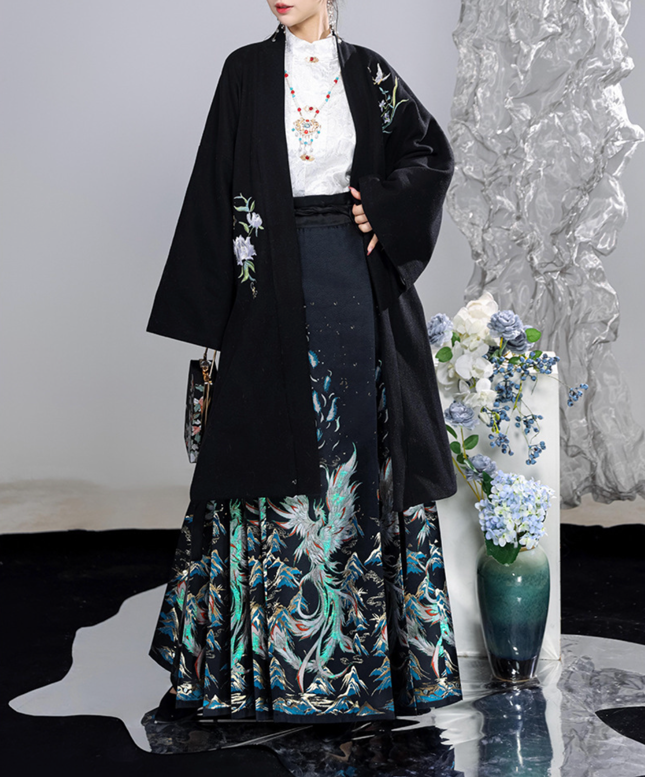 美しい山水と鳳凰のモチーフが描かれ、馬面裙全体が繊細かつ華麗な仕上がりに。織金の技法が放つ輝きが、ひときわ目を引きます。