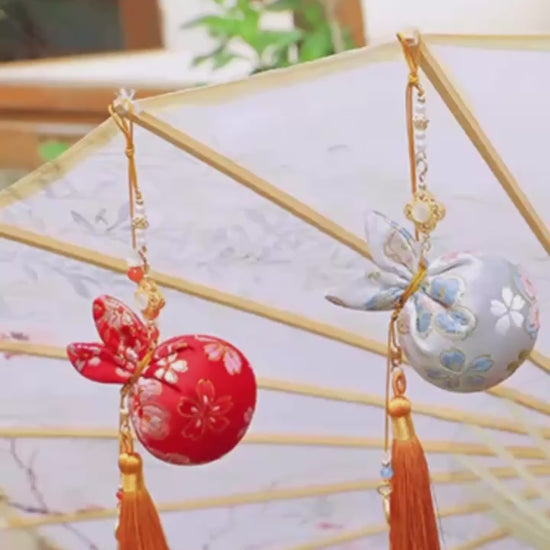 耳の紐を解くと、中には綿が入っており、香り物を入れることができます。